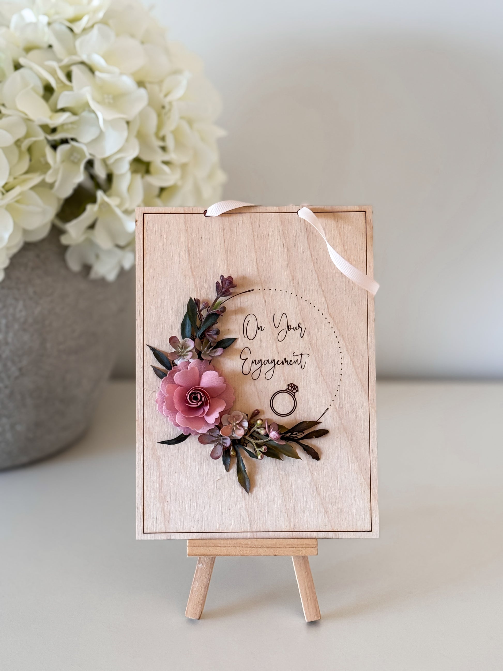 Celebrate their love story with this beautiful personalized engagement plaque. Handcrafted from plywood and lovingly adorned with delicate cotton handmade flowers, it's a perfect keepsake to mark this special moment.