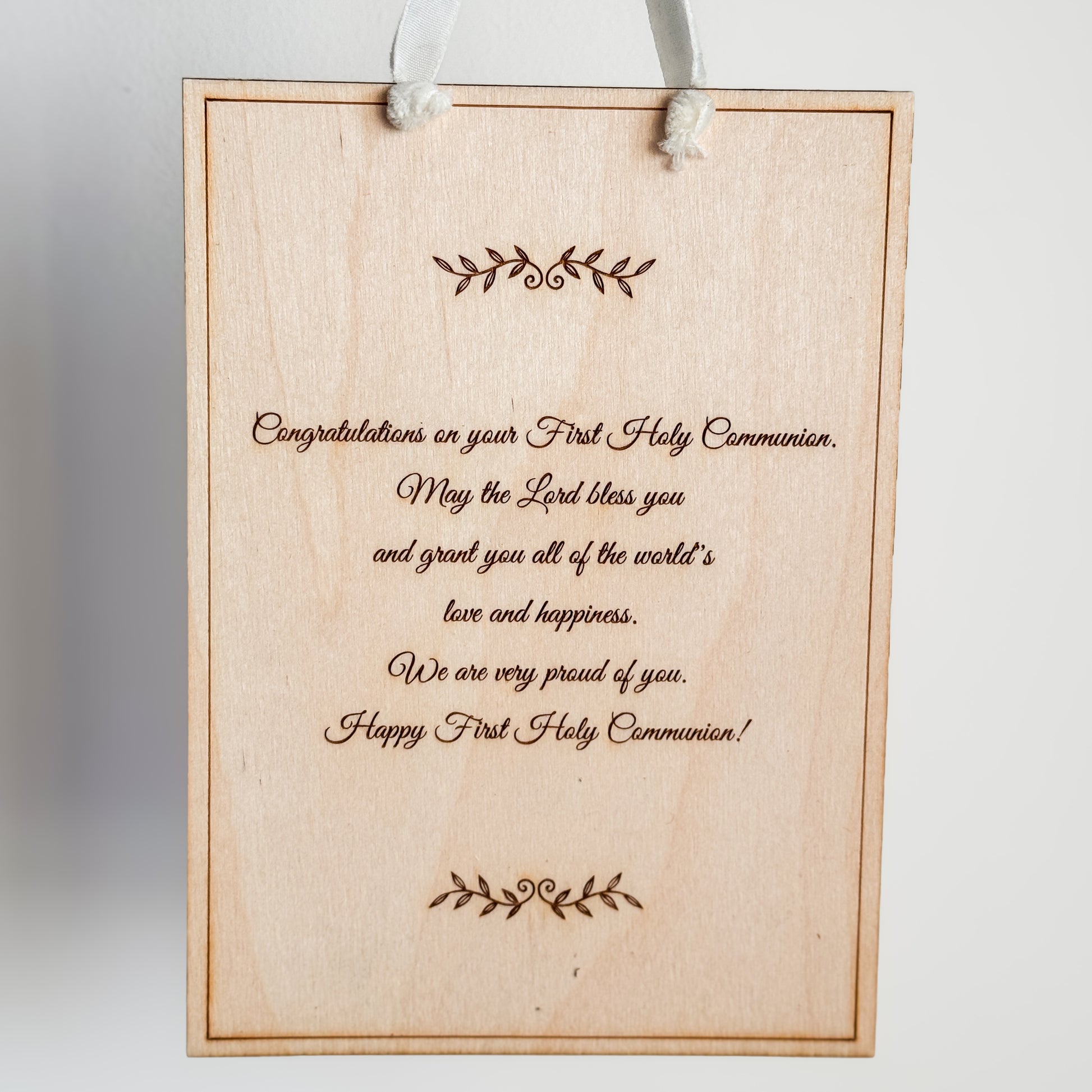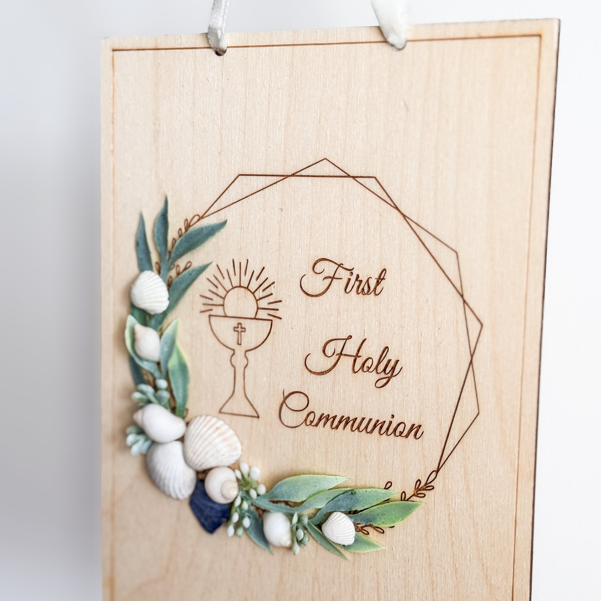 Celebrate his sacred milestone with a keepsake that will be treasured forever. This beautiful laser-cut wooden plaque features a coastal theme with natural seashells and faux greenery.
