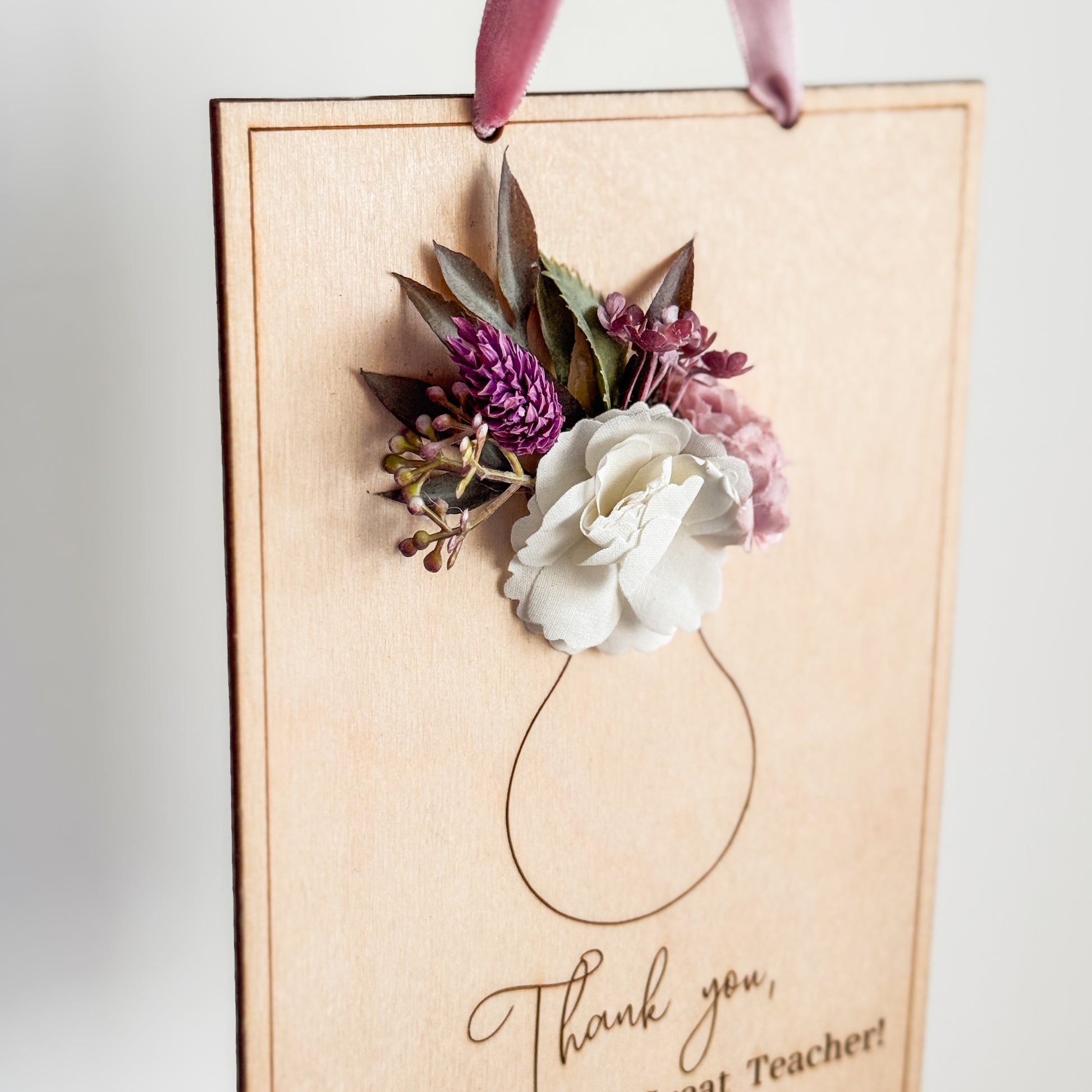 Show your child's teacher how much their hard work means with this thoughtful thank you plaque. Handcrafted from wood and beautifully adorned with a small bouquet of cotton handmade flowers and preserved blooms.