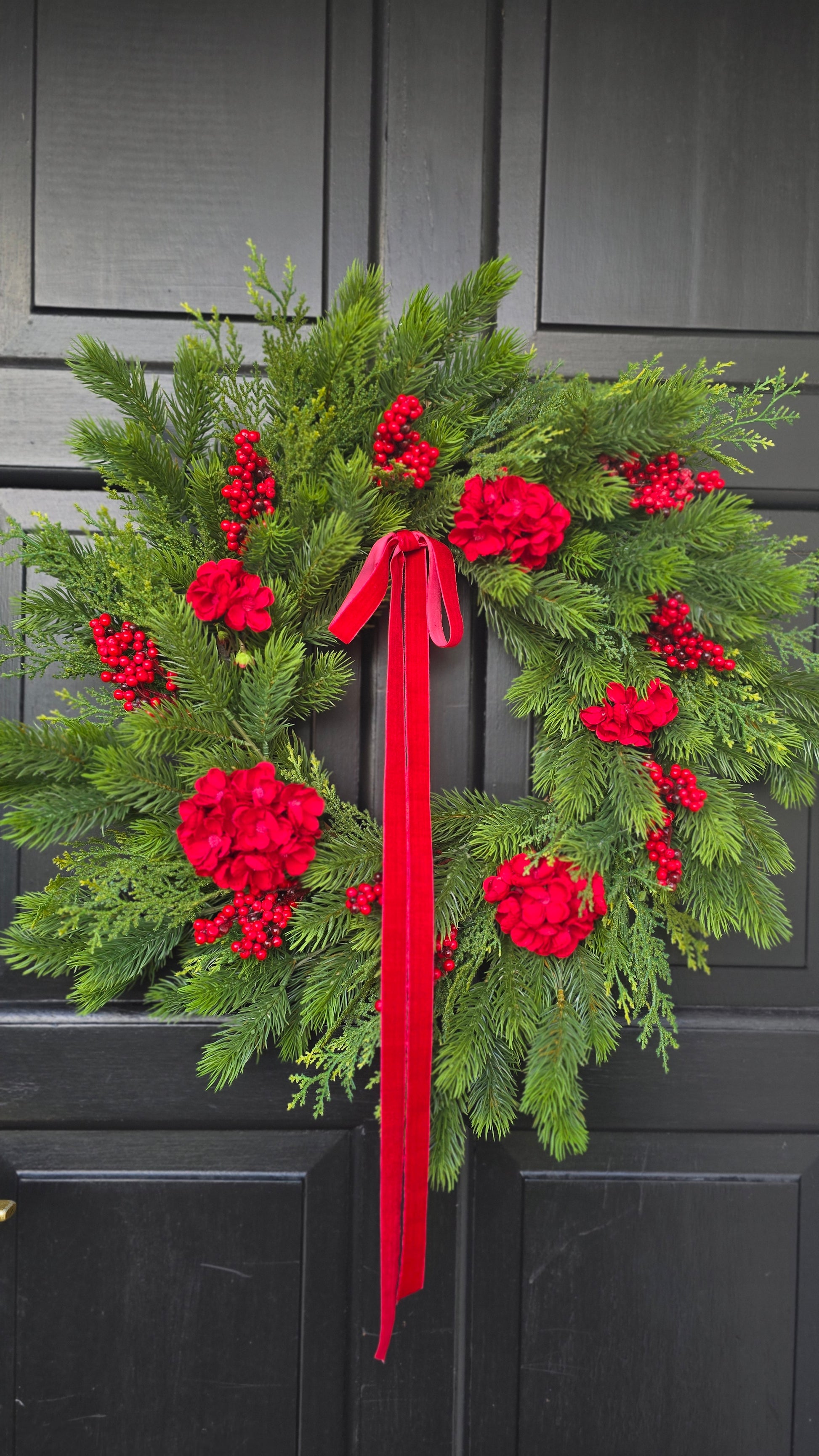 Welcome the season with this stunning handcrafted Christmas wreath featuring lush evergreen branches, vibrant red geraniums, and festive berry clusters. Finished with an elegant red velvet ribbon, this wreath brings traditional holiday charm to your front door or interior space.