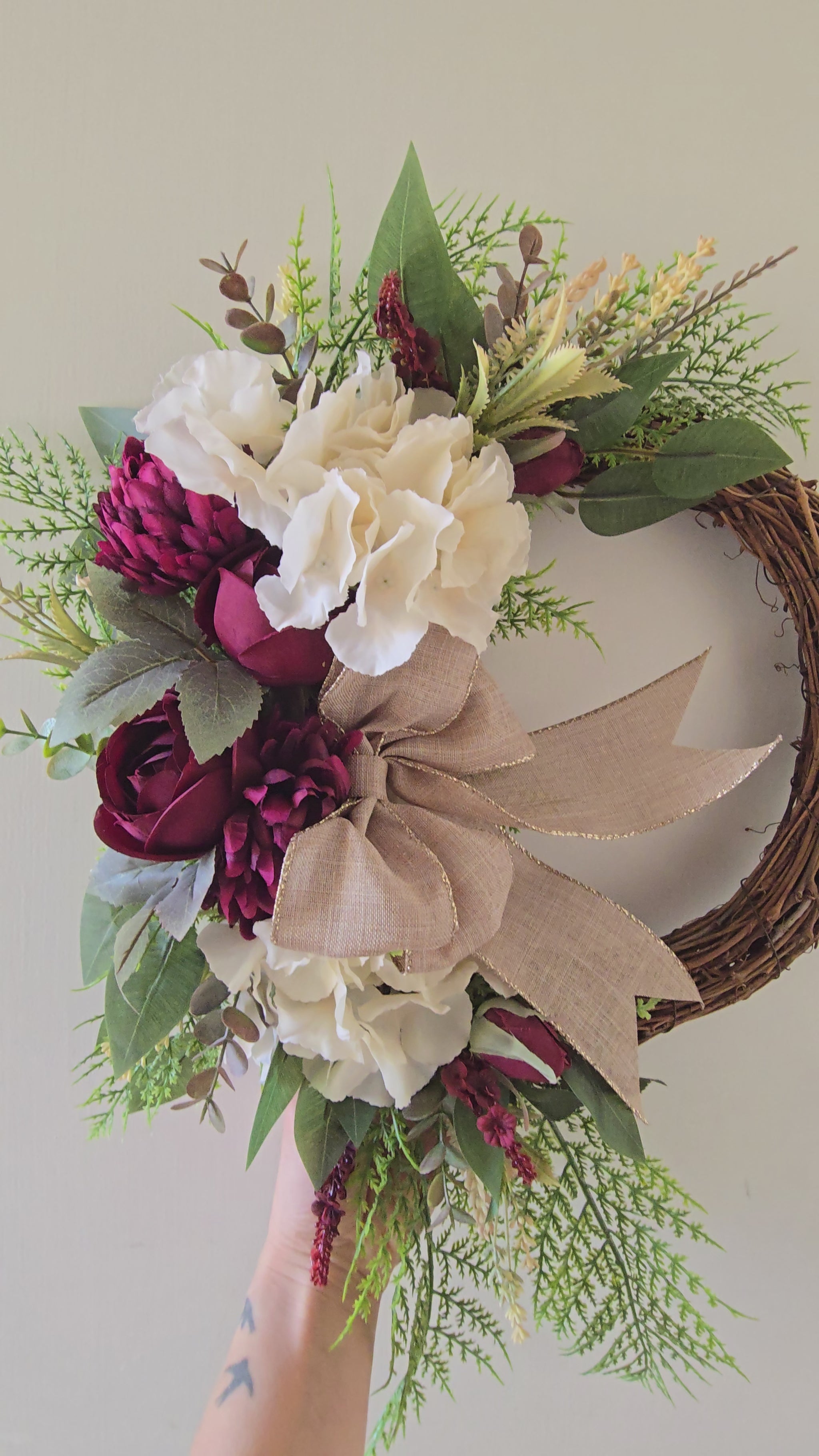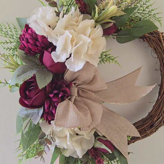 This farmhouse style wreath is designed to be a year-round beauty, featuring gorgeous burgundy blooms and cream hydrangeas.